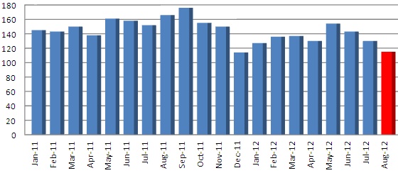 Thomson Reuters’ FX platform saw its average daily volumes fall by 11.5% to $115 billion last month. That was more than 30% down on August 2011 and the lowest reading of the year so far.