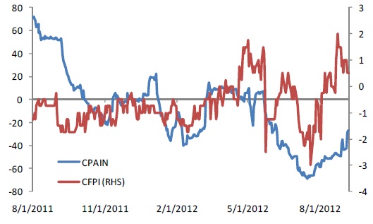 Furthermore, the CitiFX Positioning Indicator (CFPI), which measures positioning among funds on the CitiFX Access platform and is weighted more heavily towards active trading, continues to trade in positive territory after a similar surge to the PAIN indicator.
