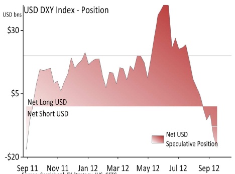 The latest Commitment of Traders report, issued by the Commodity Futures Trading Commission, shows the value of the net short USD position at $16 billion – a level not seen since August 2011 – in the week to September 18.