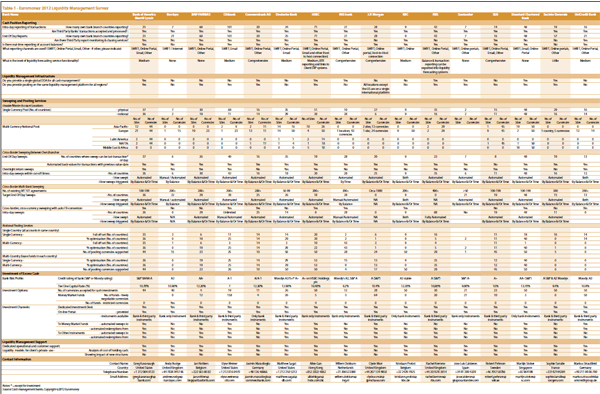 Only half of the participating banks offer a single account for all cash management and only 10 provide pooling on the same liquidity management platform for all regions – although JP Morgan does now have all locations except the US on a single international platform.
