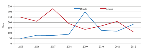 Back to those Dealogic figures for investment-grade corporate DCM volume for the year to May 11. The figures show that in 2012 corporates have raised $182 billion in the bond markets compared with $113 billion from syndicated loans. Last year, over the same period, bond markets provided $118 billion of finance, compared with $210 billion raised through syndicated loans. In 2010, bond markets provided $126 billion and the syndicated loan market $167 billion.