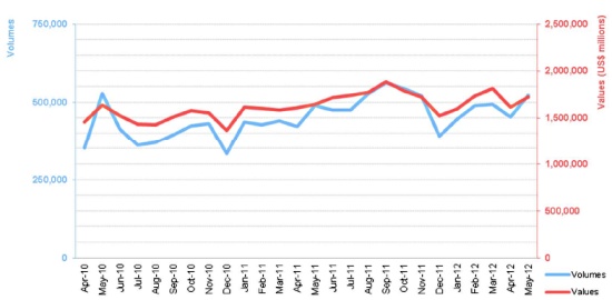 They showed the value of trades submitted for clearing in May were up 12% for spot on the month, 2% for swaps and 4% for forwards. On the year, spot values were down 10%, while swap values were up 9%.