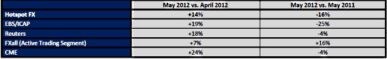 Figures showed average daily volumes at Hotspot rose by 14% to $56.5 billion last month, with a total of $1.299 trillion traded over the platform. However, that was still down 16% since May 2011. The rise in volumes at Hotspot was replicated across the industry last month as renewed fears over the potential for Greece to leave the eurozone pushed EURUSD, easily the most traded currency pair, out of the tight trading range that had subdued activity in the first few months of the year.