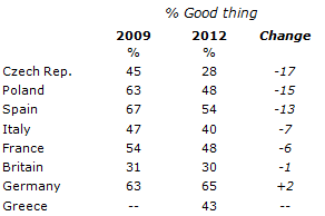 Only in Germany is there a growing majority that believes that integration has been an economic boon for the nation and a strong majority that says EU membership has been good.