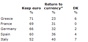 Although the popular view in France, Italy and Spain is that joining the single currency was a mistake, the survey shows there is reluctance to return to their native currencies at this point. Despite growing calls for a Greek exit from the single currency, of the countries surveyed the Greeks showed the greatest willingness to remain in the eurozone, with only 23% endorsing a return to the drachma.