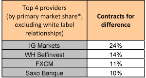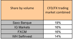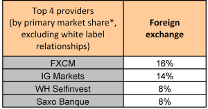 While the market in France has not produced an established market leader, several market-share metrics do point to a clear advantage to four providers – IG Markets, WH SelfInvest, FXCM and Saxo Banque.