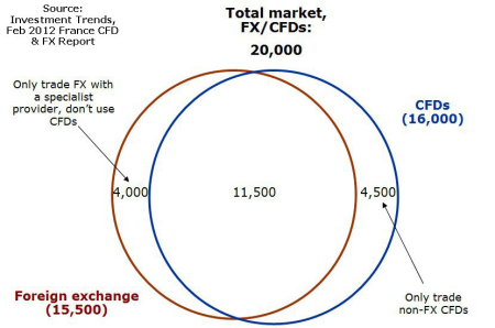 The French retail FX and contract-for-difference (CFD) market is still relatively young, with just 20,000 people who traded CFD and/or retail foreign exchange in the 12 months to February 2012, states Investment Trend’s 2012 France CFD and foreign exchange report. The report shows that 16,000 people used CFDs, 15,500 traded retail FX and 11,500 traders were active in both markets.