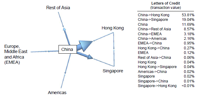 Swift’s data show that the use of renminbi for the issuance of letters of credit is concentrated heavily in Asia. Well over 50% of all letters of credit in transaction value were sent by banks in China to Hong Kong, with nearly 20% going from China to Singapore.