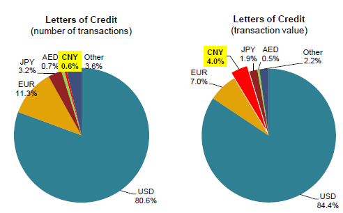 The US dollar remains by far the dominant currency for this type of trade finance, with an 84% market share, but it is noteworthy that the Chinese renminbi outpaces the Japanese yen (1.9%) and is not far behind the euro (7%) by overall value of transactions.