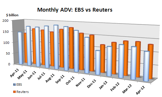 Volumes on Reuters have been steadily higher than those on EBS since November 2011.