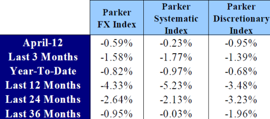 In addition to the broad Parker FX Index, there are two style-driven sub-indices: the Parker Systematic Index, which tracks those managers whose decision process is rule based; and the Parker Discretionary Index, which tracks managers whose decision process is judgemental.