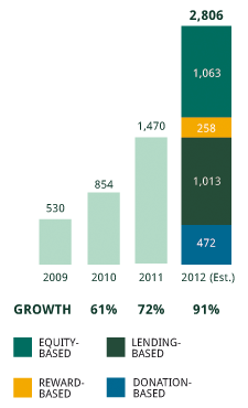 In 2011, $1.47 billion in capital was raised via crowdfunding. Funding volume for 2012 is expected to be $2.8 billion.