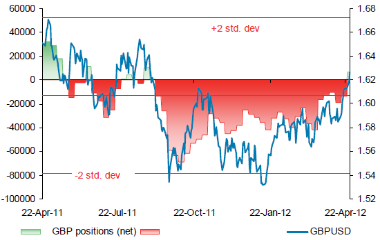 The latest Commitment of Traders report, issued by the Commodity Futures Trading Commission, shows non-commercial traders net bought more than 20,000 GBP futures contracts with a notional value of more than $2 billion in the week to April 24. Positioning in GBP now stands at a net long of $0.8 billion. Bullish sentiment in sterling has been building since the Bank of England’s minutes from its April meeting pointed to a less dovish stance.