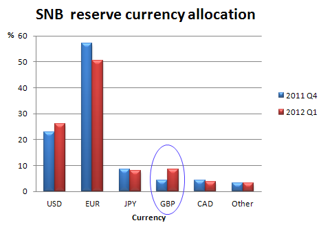 The move appears to be part of a policy to diversify its holdings away from the euro, which have ballooned in recent years, as the bank has fought to suppress the value of the Swiss franc. It also coincides with renewed strength in the pound, which is being seen as a proxy for the Swiss franc as investors seek a haven from the problems in the eurozone.