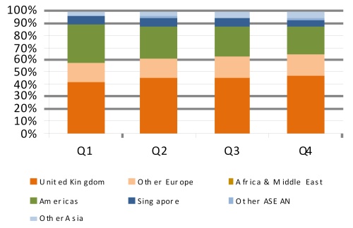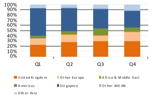 In RMB payments, Singapore started strongly early in 2011, but lost ground and its share fell from 52.9% in the first quarter to 30.6% in the fourth quarter. In contrast, the UK’s share rose from 22.1% in the first quarter to 30.0% in the fourth quarter.