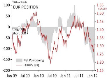 Evidence emerged that investors were still wary over eurozone sovereign debt as positioning data from the CFTC showed traders took the rally in the euro as an opportunity to get shorter of the single currency, raising the value of their short positions in the currency by $2.4 billion to an all-time high of $27.9 billion by January 24. That was the fifth consecutive week that investors pushed short euro positions to fresh highs. Short euro positioning as a percentage of open interest rose from 53.2% in the previous week to 54.3%, close to record highs and demonstrating strong investor conviction in the position.