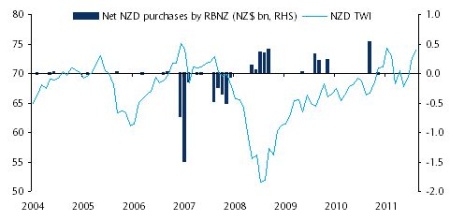 Furthermore, he says, the NZD trade-weighted index is still more than 4% below the mid-2007 highs, according to his estimates. Finally, he adds, it is not clear that FX intervention would be compatible with interest rates priced to rise from historical lows.