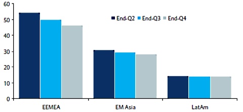 Second, says Brown, in some of the EM destination markets – central Europe, for example – EU banks are likely to face a long period of sluggish growth as fiscal policy is kept tight and weak exports act as a drag on demand.