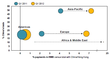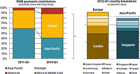 Excluding China and Hong Kong, Europe’s share in RMB payments increased from 36% in the first quarter of 2011 to 47% in the first quarter 2012, whereas Asia-Pacific’s share declined from 59% to 41%.