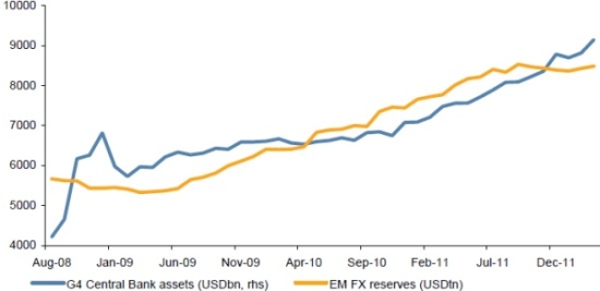 EM FX reserve accumulation has matched G4 central bank asset accumulation (QE) |