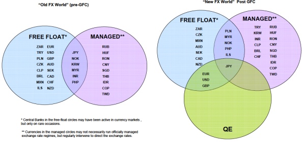 The bank says the free-float mantra that underpinned the period of Great Moderation has been challenged by heavy-handed meddling in FX markets since the global financial crisis of 2008, as growth has become the main policy preference for developed and developing nations. Imran Zaheer Ahmad, strategist at RBS, says the exchange rate is now seen as a key tool in central banks’ policy armoury to stimulate still-ailing economies.