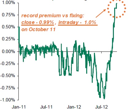 That means that since then for market forces to be responsible for the move in USDCNY, either clients started to buy the renminbi aggressively or that banks in mainland China have taken long positions in the currency to take advantage of high interest rates.