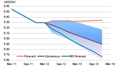 The bank forecasts that the renminbi will rise by 4.5% against the dollar, despite the recent run of weaker-than-expected economic data. While a slower domestic economy would typically imply a more hesitant approach by China regarding renminbi appreciation, Morgan Stanley believes it could have the opposite effect.