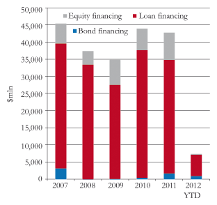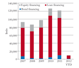 There is no shortage of willing investors to realize this strategy: record numbers of infrastructure and sovereign wealth funds are now chasing these assets. “There is much more capital chasing infrastructure now,” says Daniel Wong, senior managing director and head of infrastructure and utilities at Macquarie in London. “Equities are too volatile and bond returns are too low. Investors are looking for the kind of stable returns that real estate used to provide but no longer does.” Indeed, according to data provider Preqin there were 144 infrastructure funds in the market in the first quarter of 2012, with an aggregate fundraising target of $93 billion. So for once there is a happy alignment of investor appetite and funding need. But in these markets nothing is that simple. “The demand for investment is strong and the supply of deals is strong,” says Wong. “But in some countries, debt is the problem.” And it has been for a long time. Persistently dysfunctional debt markets since the financial crisis began mean that many infrastructure projects now face an uphill struggle to get financed even with healthy equity appetite for the assets. “Financing structures need to incorporate 70% to 80% debt to achieve the returns that the infrastructure funds are looking for,” says Spencer Lake, co-head of global markets at HSBC. “When debt gets down to 50% or 60% the funds are not interested. A shortage of debt means we are seeing projects simply not get financed – things are either being put on the back burner or cancelled.”