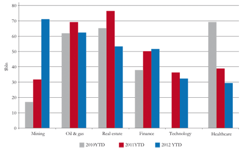 As the first quarter drew to a close, Dealogic provided figures comparing the first two-and-a-half months of 2012 up to March 16 with similar periods in previous years. By number of deals, activity is down by 10.5% in 2012 compared with 2011. By deal value, the decline is even more marked. The absence of large deals, Glencore aside, leaves volumes down by 23.3%. Fees are down by some 14.5%.