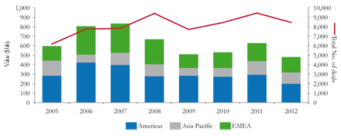 This year has started with the European Central Bank appearing to remove the worst of the fat-tail risk from the interlinked fortunes of eurozone sovereigns and banks with its Long-Term Refinancing Operations, risk markets rallying strongly, and signs emerging of a US economic recovery beginning to bolster employment and an outcome in Europe not quite as bad as the doomsters were predicting at the end of 2011. It’s an oddity that for M&A volumes to pick up, the equity capital markets have to be open too, often as an indicator of confidence but also for technical reasons. Take private equity sponsors wanting to exit mature positions, sell portfolio companies and return cash to investors in their funds. They will be much happier that they are achieving the best price if, as well as soliciting bids from other sponsors, they can also cross-check such valuations against what might be achieved in the IPO market and through sales to strategic industry buyers.