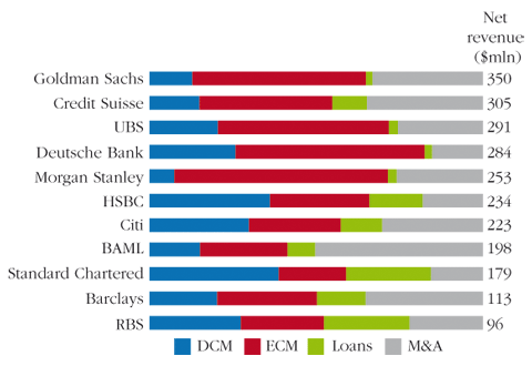 Besides, looking at those same league tables, the more diversified approach might look healthier in percentage terms but it doesn’t put banks at the top in overall revenue. In 2010 HSBC’s nicely balanced split of fee revenue – 32% DCM, 27% ECM, 21% loans, 20% M&A – was only enough to rank it 16th in investment banking fees (having bolstered ECM, it moved up to seventh in 2011). Standard Chartered, similarly diversified, ranked 18th in 2010, and RBS – which has since ditched equities completely – 25th. Barclays, having not yet gone into equities by then, didn’t even make the table.