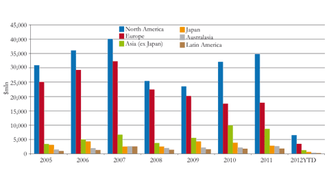 If banks are over-reliant on ECM, they are equally over-reliant on China. In 2011 China accounted for 54% of Asia ex-Japan investment banking revenue, a figure that has risen steadily from 29% in 2005. Within ECM, it is almost absurdly dominant: 70% of total Asia ECM revenue in 2010, and 66% in 2011. It also accounted for 67% of 2011 DCM fee revenue, and, though less dominant, has become a focal point of M&A as well. (for further reading see: Investment banking in Asia: How are China JVs faring?, Euromoney, April 2012)