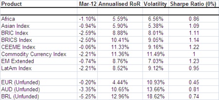 For instance, there was no reciprocal rally in the euro. The EUR unfunded index lost 0.22% in March, while the AUD unfunded lost 3.25% during the month.