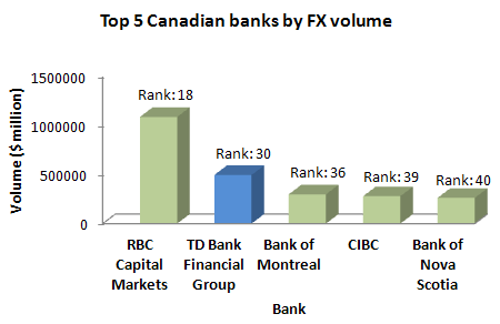 In Euromoney’s 2011 FX Survey, TD climbed six places to number 30, with a market share of 0.28%. The bank will be looking to rise even higher in the 2012 survey. To help that push, TD hired Steve Smith in March last year from Crédit Agricole to run FX institutional sales based in London.