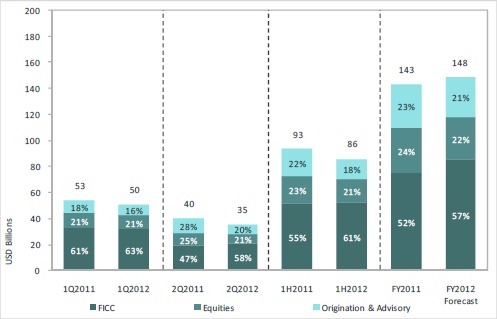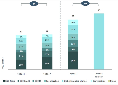 Across fixed income, revenues rose 2% to $52 billion in the first half of 2012. For the full year, Coalition forecasts fixed-income revenues of $84 billion, a rise of 12% on 2011.