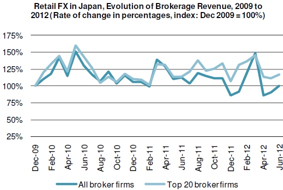 As reported previously by EuromoneyFXNews, Japan is the world’s second-biggest retail FX centre after the UK, with average daily volumes predicted to hit $114 billion by 2013. Aite, which draws on a proprietary database of brokers, as well as survey data and official statistics, says average revenue across the FX retail industry in Japan has fallen 24% on December 2009 levels.