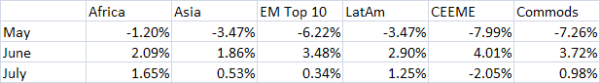 The passive, fully funded currency indices provided to EuromoneyFXNews show that most EM currencies produced positive returns in the month. However, the returns were noticeably more disparate than they have been in the past. Still, EM indexes generally had their second consecutive month of positive returns. The worst performer was the CEEME index, which lost 2.05%, after gaining 4.01% in June, and the only index to yield a negative return. The best-performing index was Africa, which returned 1.65%, followed by Latin America.
