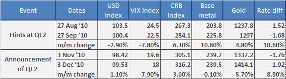 In the month after the announcement of QE2, short-term US interest rates fell and the US-RoW interest-rate differential widened. The S&P500 index rallied and asset market volatility (VIX) declined. Commodity prices strengthened across the board and the USD fell 2.9%. Interestingly, in the month after actual implementation of QE2, the pattern of asset market behaviour was quite different. The US-RoW interest-rate differential continued to widen, the VIX index continued to decline, gold and the CRB index rose but base metal prices fell and the USD strengthened 1.1%.