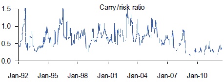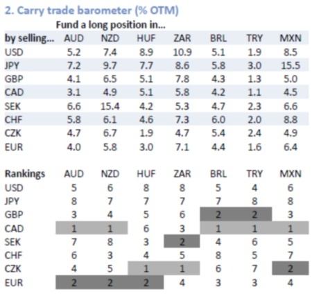 Indeed, RBC conducts analysis on the euro carry trade with its “carry trade barometer”, which looks to quantify the trade-off between yield pickup and volatility cross high/low yield currency pairs using option pricing.