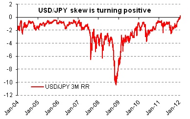 The USDJPY risk-reversal curve is now pricing dollar calls over puts up to the three-month expiry, with one-month risk reversals trading at 0.7 and three-month risk reversals trading at 0.2.