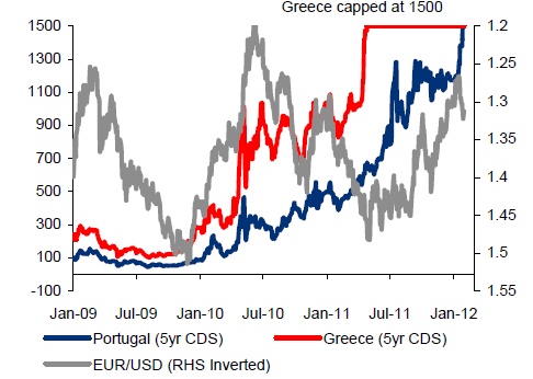 Greece, Portugal 5-year CDS versus EURUSD |