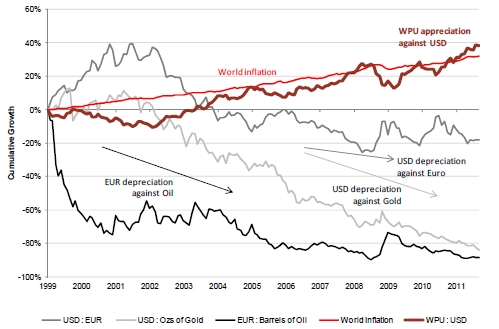 The return on the FTSE WPU depends on the currency in which it is measure. Taking the example of the using the WPU to hedge US dollar exposure, while the USD has lost value against the EUR and gold, the WPU has appreciated against the dollar in line with global inflation.