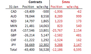 Investors on the CME sold the USD against all currencies in the week to January 31 except the CAD. They sold a net $6.6 billion over the week, taking the net long position to $12.19 billion – its lowest since November.