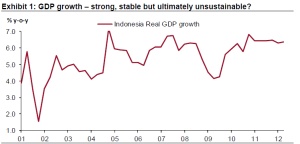| “There is, however, plenty of precedent for the market to force quicker and more aggressive action on Bank Indonesia and modelling the likely development of the current account deficit we believe history may well repeat itself via a sharp depreciation of the rupiah. This could happen as early as the first half of 2013 and we have made a number of forecast changes to reflect this. The good news is that the earlier the necessary policy adjustments are made the more modest will be the eventual hit to economic activity.” |