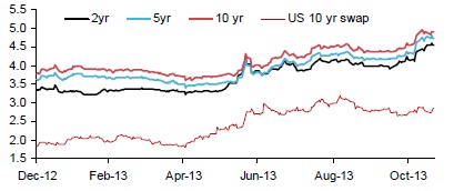 | Chinese swap rates rising independently of the US or Asian rates |