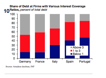 The IMF’s analysis showed that in Portugal 50% of corporate debt is owed by firms that have an interest coverage ratio of less than one, meaning they don’t earn enough income to service their debt, compared with 40% and 30% in Spain and Italy, respectively.
