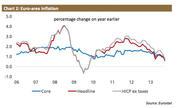 Expected growth in 2014 has been revised down from 1.1% to 1% and inflation will stay well below target in 2014 and 2015 due to record unemployment, lack of consumer confidence and weak bank lending.