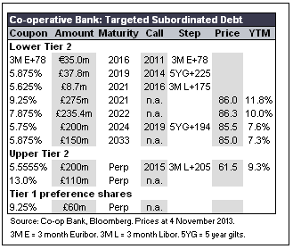 The 13% bondholders are being offered new subordinated instruments in Co-op Group while the 5.55% bondholders are being offered new subordinated instruments in Co-op Bank. Coupons on both are mandatory, rather than the deferrable coupons on the existing securities.