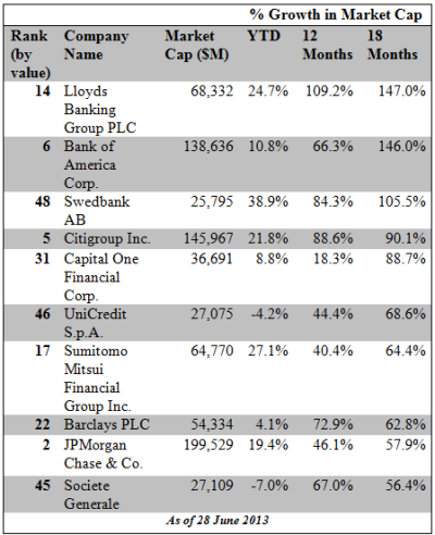 The best performer in 2013 year-to-date was Swedbank’s 38.9% increase in market cap. The Swedish bank’s growth coincides with a focus inward on their core markets, as they have just signed an agreement to sell off a Ukrainian subsidiary and discontinue operations in Russia.