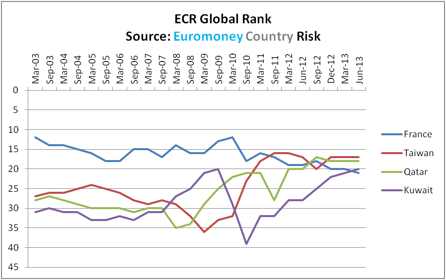 With a global rank of 21, France is considered riskier than Kuwait, Qatar and Taiwan – three countries that continue their ascent in the ECR global rankings. Countries in ECR’s tier two typically score between 65 and 79.9 – which can be equated with a credit rating of A- to AA.